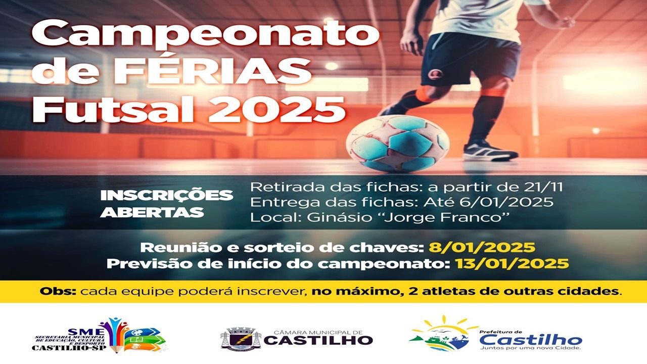 ATENÇÃO AMANTES DO FUTSAL: O setor de Esportes da Prefeitura de Castilho abre nesta quinta-feira (21) o período de inscrições das equipes que disputarão o CAMPEONATO DE FÉRIAS DE FUTSAL 2025.