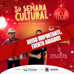 A Secretaria de Educação, Cultura e Desporto informa que a programação da 3ª SEMANA CULTURAL anunciada para esta sexta-feira, 29, FOI ADIADA em virtude das chuvas. A nova data será divulgada em breve, em anúncio próprio.