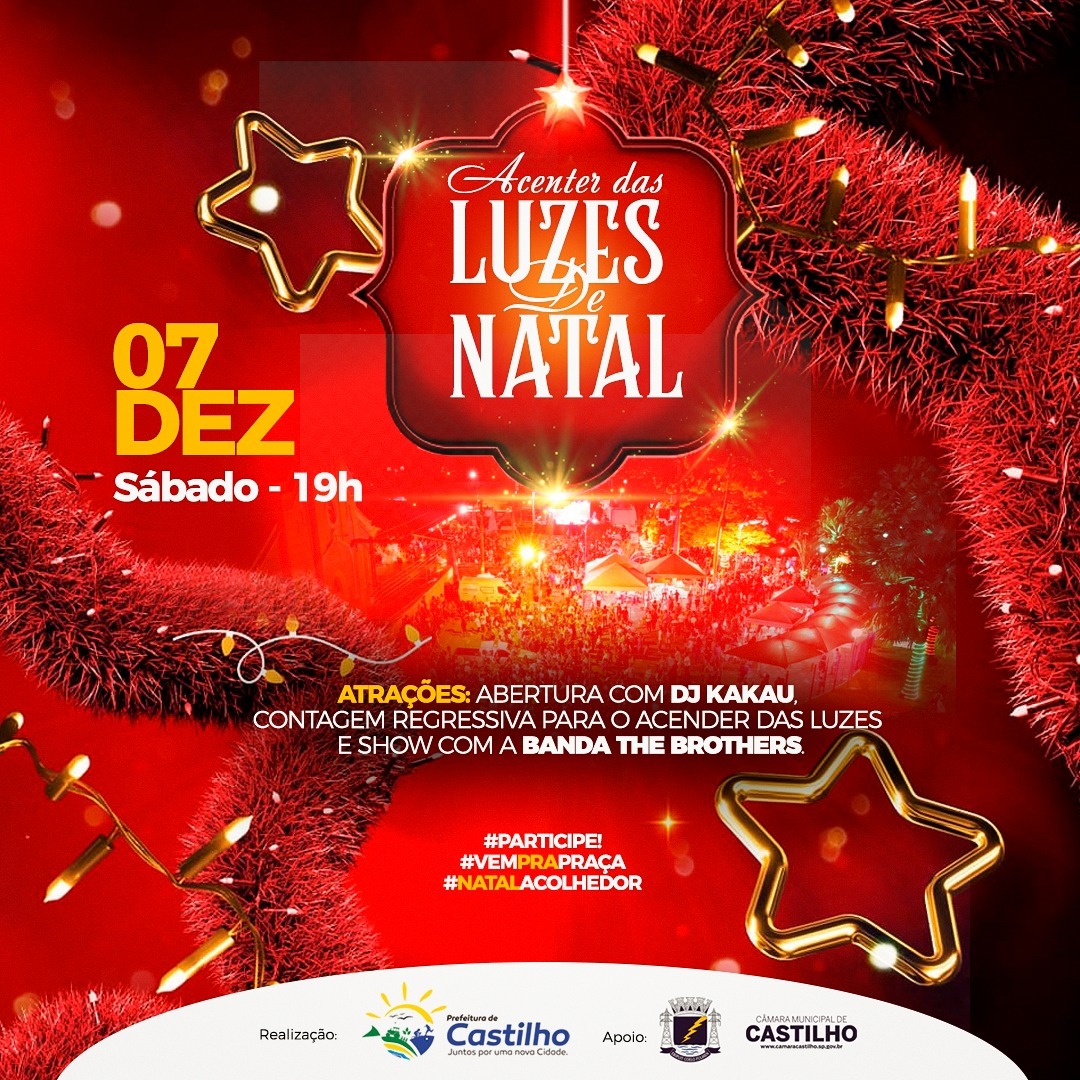 CASTILHO – Três dias após inaugurar a Casa do Noel, chegou a hora de Castilho acender oficialmente as luzes natalinas da Praça da Matriz. Numa mistura de som luzes e cores, o evento terá ainda duas atrações artísticas com apresentações do dj kakau e em seguida show da banda The Brothers.