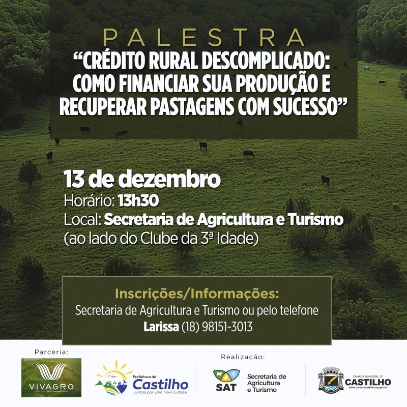 No próximo dia 13 de dezembro, a partir das 13h30, a Engenheira Agrônoma Viviane Dobri estará em Castilho para apresentar a palestra: “Crédito Rural Descomplicado: Como Financiar Sua Produção e Recuperar Pastagens com Sucesso”.