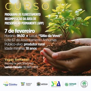 Os produtores rurais de Castilho que tenham mais de 18 anos já podem ir à SAT – Secretaria de Agricultura e Turismo (ao lado da Terceira Idade) ou, se preferirem, se inscrever pelo WhatsApp 18 98151-3013 (com a Larissa) para um curso inédito de sensibilização sobre a importância do Programa de Florestamento.