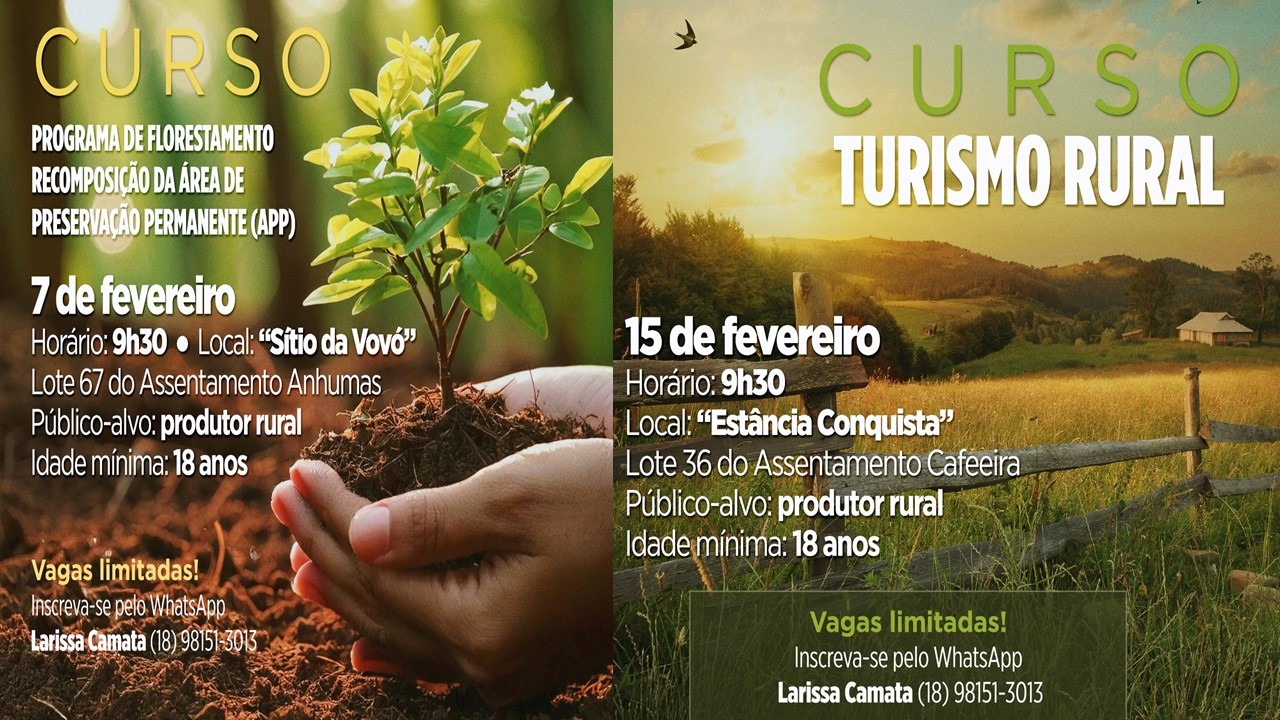 Outra oportunidade está agendada para o dia 15 de fevereiro, data em que acontecerá o curso de Turismo Rural. A exemplo do anterior, este também terá início às 09h30 e a quantidade de vagas é limitada. Desta vez, o encontro com os produtores rurais castilhenses acontecerá na “Estância Conquista”, localizada no lote 36 do Assentamento Cafeeira (Demi do Rodeio).