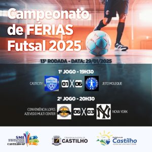 Quarta-feira, 13ª rodada do Campeonato de Férias de Futsal 2025 e o CastiCity conseguiu consolidar seu status de lanterninha absoluto e irremediável da competição esportiva mais acirrada de Castilho. E o time deixou a quadra ao término do 2º tempo, com mais uma goleada daquelas, aplicada pelo Jeito Moleque.