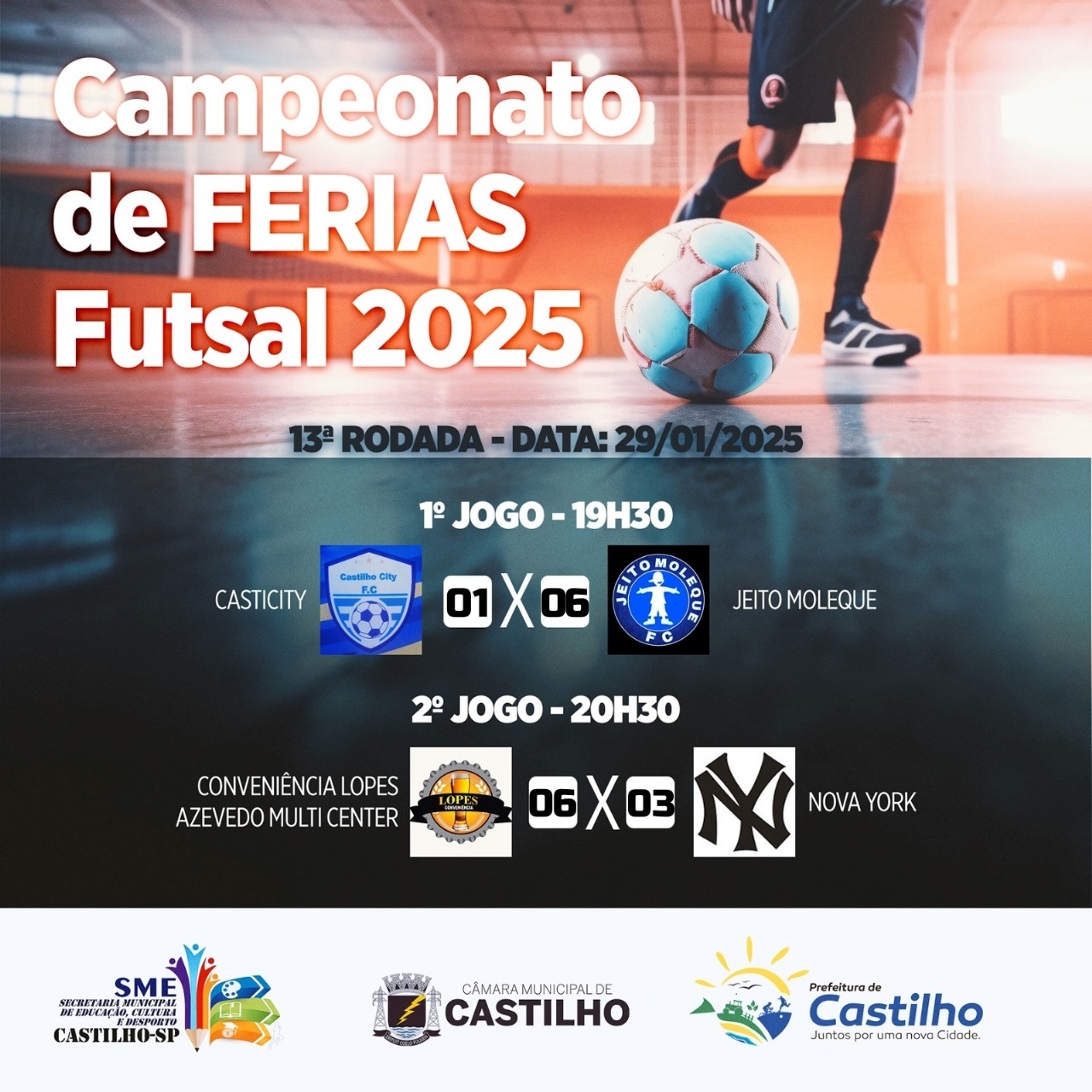 Quarta-feira, 13ª rodada do Campeonato de Férias de Futsal 2025 e o CastiCity conseguiu consolidar seu status de lanterninha absoluto e irremediável da competição esportiva mais acirrada de Castilho. E o time deixou a quadra ao término do 2º tempo, com mais uma goleada daquelas, aplicada pelo Jeito Moleque.