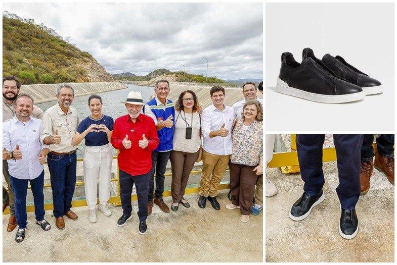 Enquanto posava para fotos em trechos da transposição do Rio São Francisco, nos pés do petista estava um luxuoso tênis da grife italiana Ermenegildo Zegna. O valor do item, Zegna SecondSkin Triple Stitch de couro, cobiçado por ricaços, R$10.550.