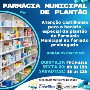 A Farmácia Municipal hoje esta fechada  mas estará de Plantão nesta Sexta feira dia 20 das 08 horas da manhã até as 12 horas, no sábado dia 21 estará de plantão das 08 horas da manhã até as 12 horas.