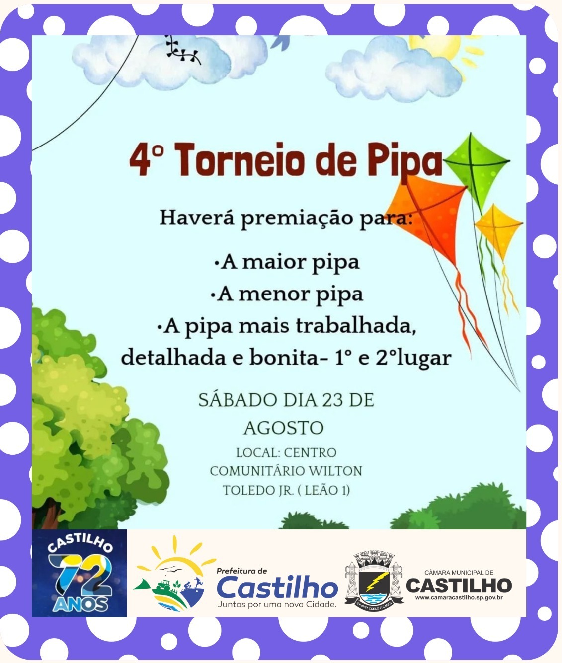 CASTILHO – Neste sábado, dia 23, a cidade de Castilho se prepara para mais uma edição do 4º Torneio de Pipa, evento que também faz parte das comemorações dos 72 anos da cidade. A Secretaria Municipal de Educação, Cultura e Desporto é a responsável pela organização do torneio, que acontecerá no campo do Leão I, localizado no Centro Comunitário Wilton Todelo Jr., a partir das 8h da manhã.