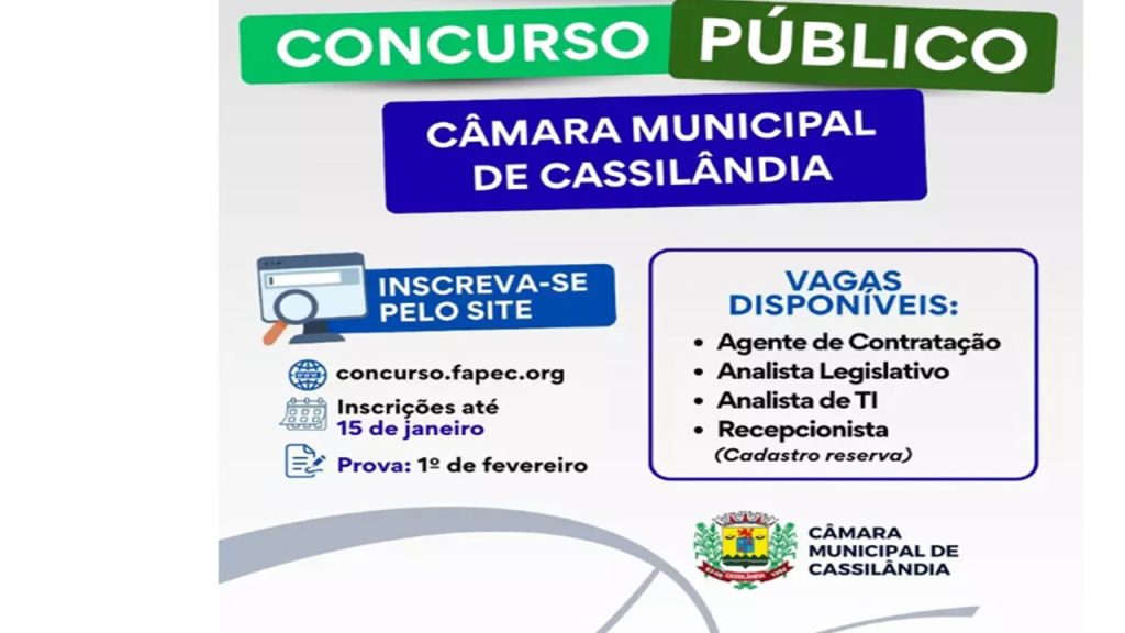 Estão abertas as inscrições para o concurso público da Câmara Municipal de Cassilândia, distante 253 km de Castilhho, que oferece oportunidades para cargos de nível médio e superior. As inscrições seguem até 15 de janeiro, e a prova está marcada para o dia 1º de fevereiro. O salário inicial é a partir de R$ 3.400 […]