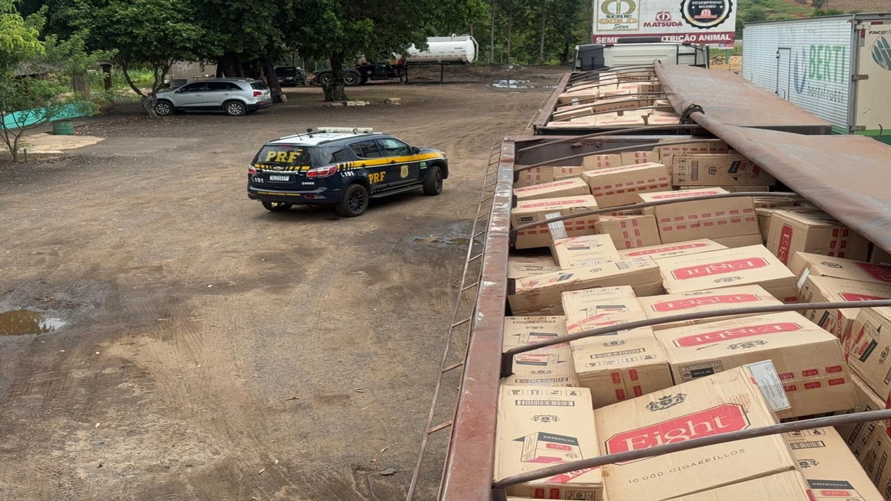 Polícia Rodoviária Federal (PRF) apreendeu 600 mil maços de cigarros contrabandeados, nesta segunda-feira (12), em Água Clara (MS).