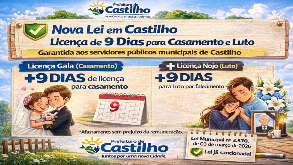 CASTILHO — O prefeito Paulo Duarte Boaventura sancionou a Lei Municipal nº 3.570, de 03 de março de 2026, que assegura aos servidores públicos municipais o direito à ampliação dos períodos de afastamento em casos de casamento e falecimento de familiares próximos. De acordo com a nova legislação, os servidores passam a ter direito à […]