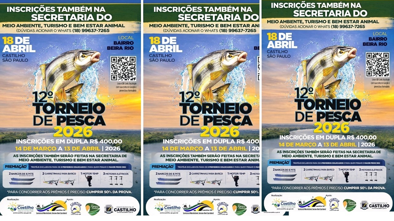 CASTILHO – As inscrições para o 12º Torneio de Pesca de Castilho seguem abertas até o dia 13 de abril. Este é um dos eventos mais aguardados do calendário turístico do município. A competição será realizada no dia 18 de abril, no bairro Beira Rio, reunindo pescadores de toda a região e também visitantes de outras cidades.