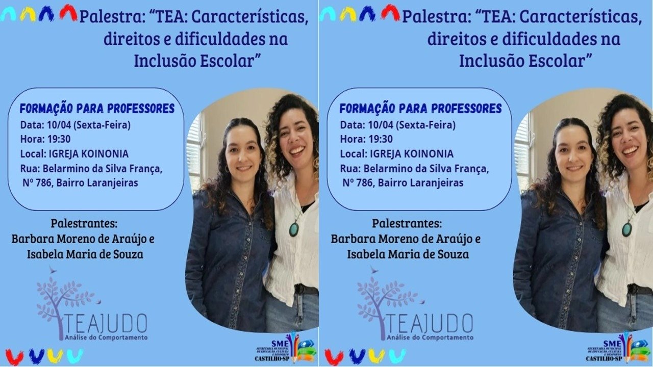Encerrando a programação da semana, no dia 10 de abril, será realizada uma palestra especial com o tema “TEA: características, direitos e dificuldades na inclusão escolar”, ministrada pelas psicólogas e analistas do comportamento Bárbara Moreno de Araújo e Isabela Maria de Souza. O encontro acontece às 19h30, na Igreja Koinonia.