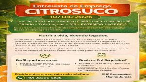 As entrevistas será dia 10/04 na Av: José Luciano Pereira 385 Centro de Castilho