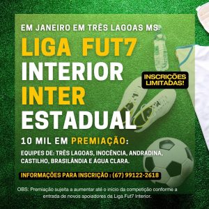 liga Fut 7 com clubes da nossa cidade e de outras cidades: Brasilândia, Água Clara, Inocência e do estado de são Paulo, Castilho e Andradina.