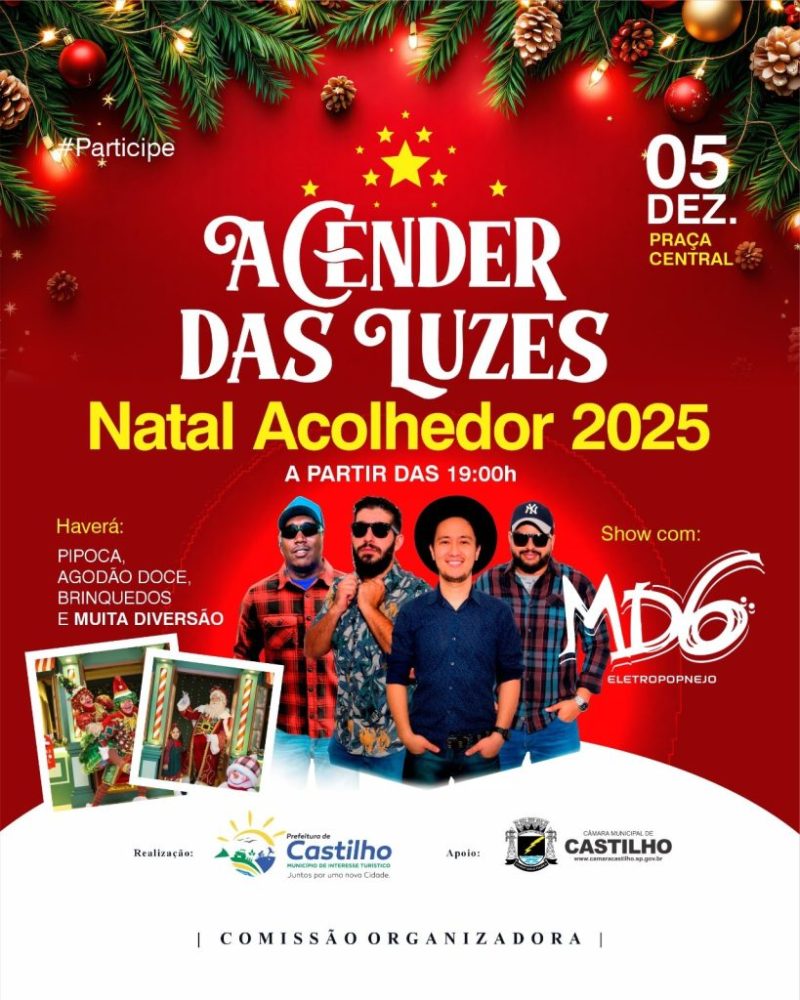 Natal Acolhedor: Castilho terá show com MD6 no acendimento das luzes de Natal