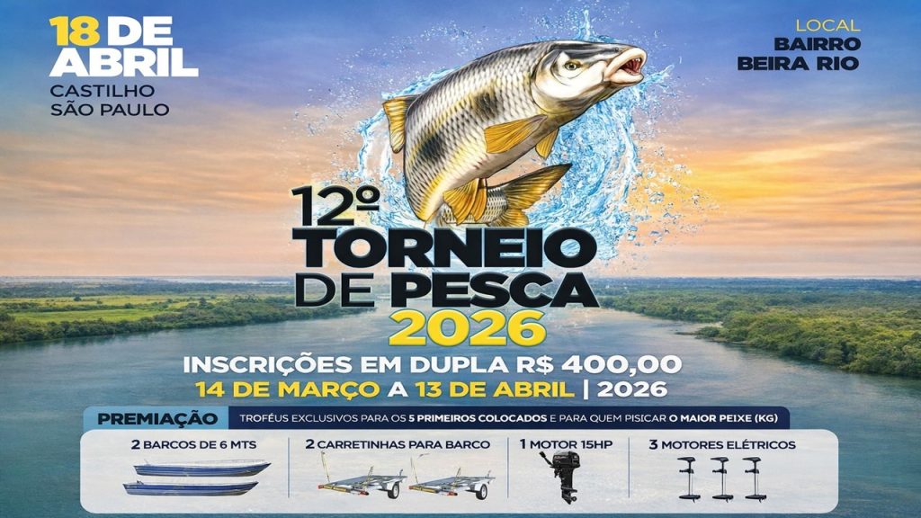 CASTILHO – A Prefeitura de Castilho abrirá neste sábado, 14 de março, as inscrições para o 12º Torneio de Pesca, um dos eventos esportivos e turísticos mais aguardados do município. Inicialmente previsto para acontecer em outubro do ano passado, o torneio precisou ser reagendado e agora será realizado no dia 18 de abril de 2026, […]