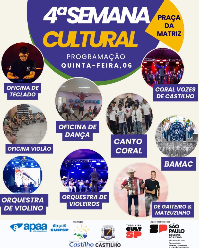 E hoje continua, em Castilho, a SEMANA CULTURAL recheada de atrações! Veja a programação: Oficina de Teclado, Oficina de Dança, Oficina de Violão, Coral Vozes de Castilho, Canto Coral, Orquestra de Violeiros, Orquestra de Violão, Orquestra de Violino, BAMAC, fechando a segunda noite Cultural Dê Gaiteiro e Mateuzinho.